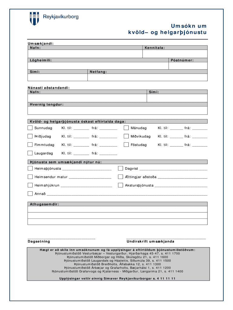 Get the free Umskn um kvld- og helgarjnustudoc - eldri reykjavik