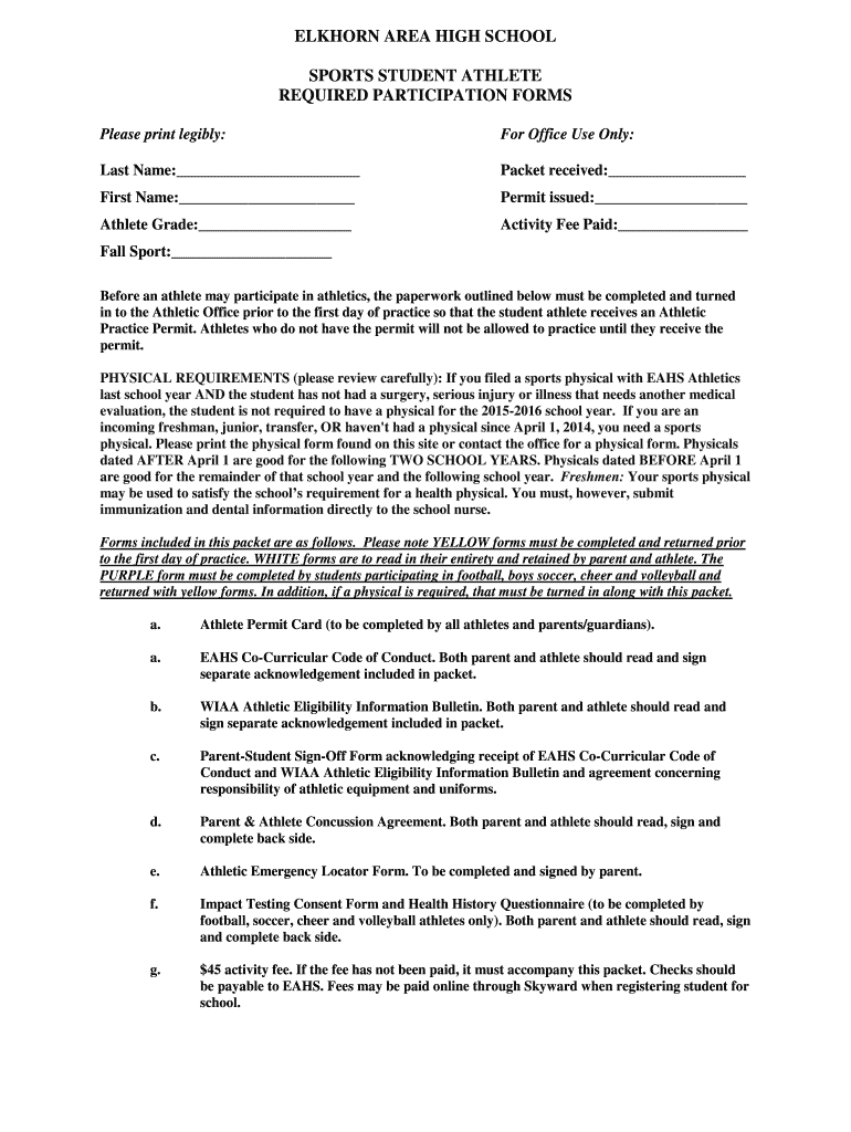 ELKHART AREA HIGH SCHOOL SPORTS STUDENT ATHLETE REQUIRED PARTICIPATION FORMS Please print legibly: For Office Use Only: Last Name: Packet received: First Name: Permit issued: Athlete Grade: Activity