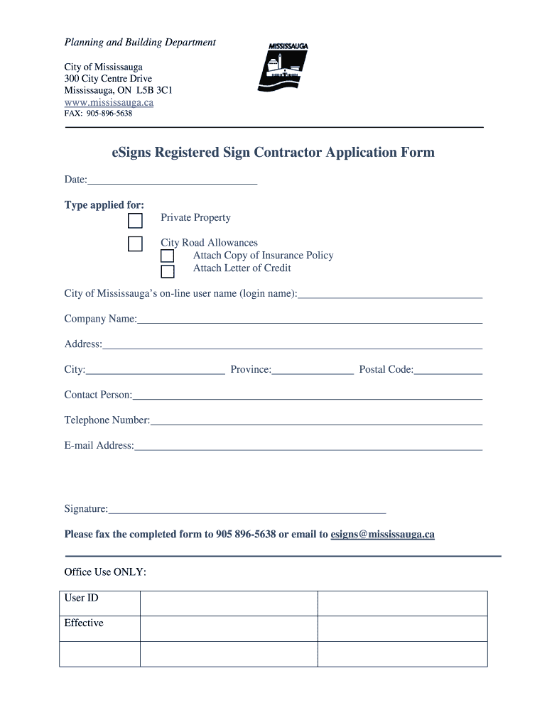 This form is used to apply for the registration as a sign contractor in the City of Mississauga, requiring information about the contractor and relevant attachments like insurance policy and letter