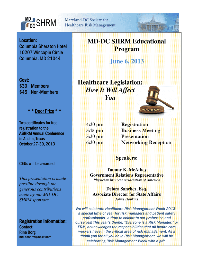 Location: Columbia Sheraton Hotel 10207 Linchpin Circle Columbia, MD 21044 Cost: $30 Members $45 Nonmembers MDC SHAM Educational Program June 6, 2013, Healthcare Legislation: How It Will Affect You