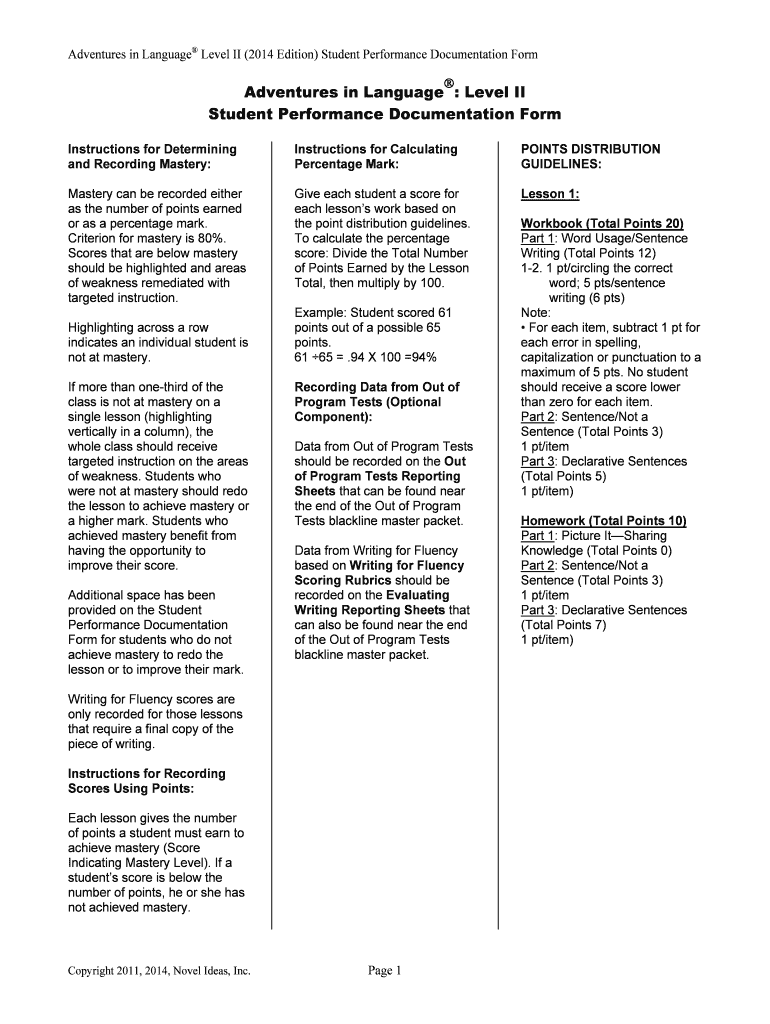Adventures in Language Level II (2014 Edition) Student Performance Documentation Form Adventures in Language : Level II Student Performance Documentation Form Instructions for Determining and Recording