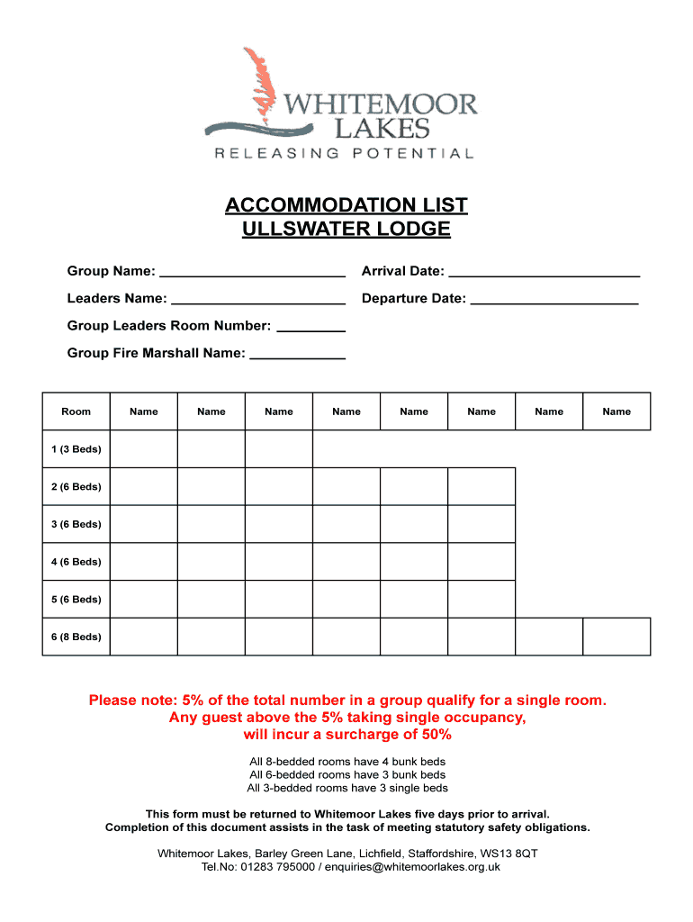 In summary, filling out the accommodation list for Ullswater Lodge involves gathering guest information, specifying stay dates and accommodation types, noting additional services or preferences, and ensuring all details are accurately recorded. The list is essential for the lodge's management, staff, and guests to facilitate a smooth and enjoyable stay experience.