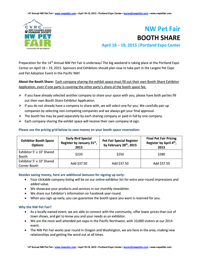 14th Annual NW Pet Fair www.nwpetfair.com April 1819, 2015 Portland Expo Center Lauren nwpetfair.com www.nwpetfair.com NW Pet Fair BOOTH SHARE April 18 19, 2015 Portland Expo Center Preparation for