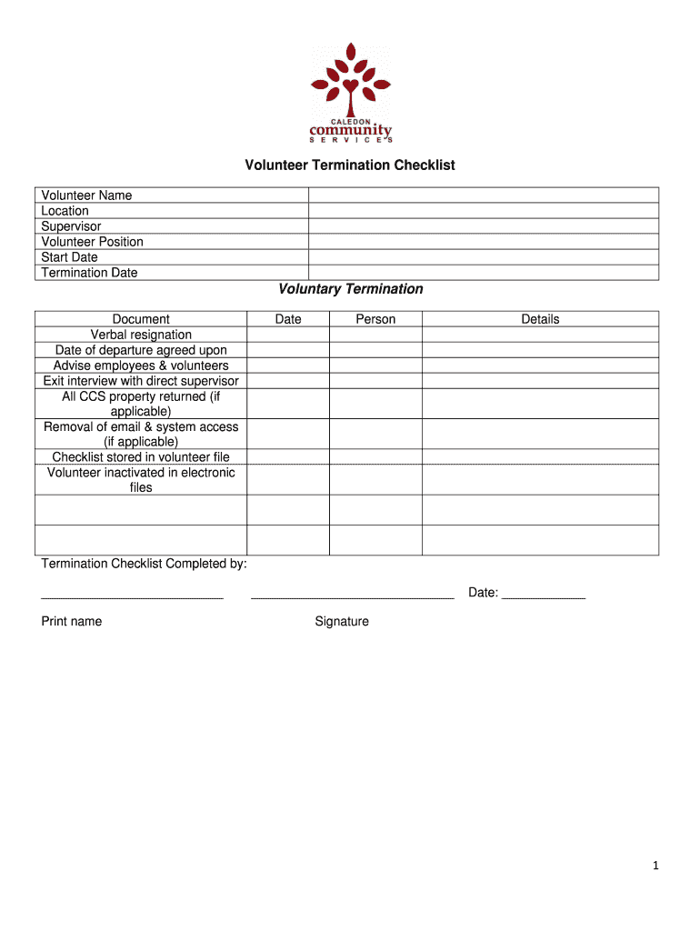 1 Volunteer Termination Checklist Volunteer Name Location Supervisor Volunteer Position Start Date Termination Date Voluntary Termination