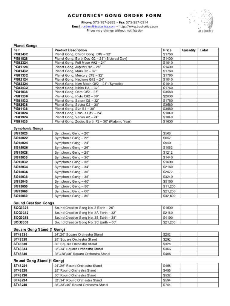 ACETONIC GONG ORDER FORM Phone: 5755872689 Fax: 5755870514 Email: orders×acutonics.com HTTP://www.acutonics.com Prices may change without notificationPlanet Gongs Item PG82432 PG81828 PG82324 PG81728