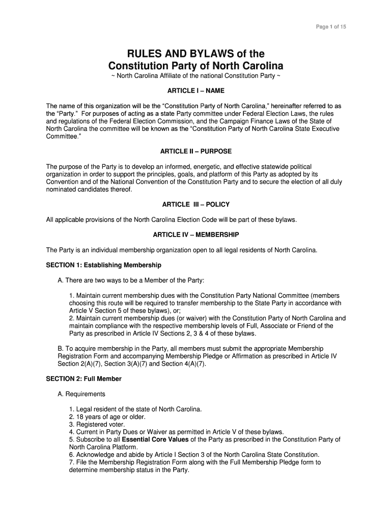Page 1 of 15 RULES AND BYLAWS of the Constitution Party of North Carolina Affiliate of the national Constitution Party ARTICLE I NAME The name of this organization will be the Constitution Party of