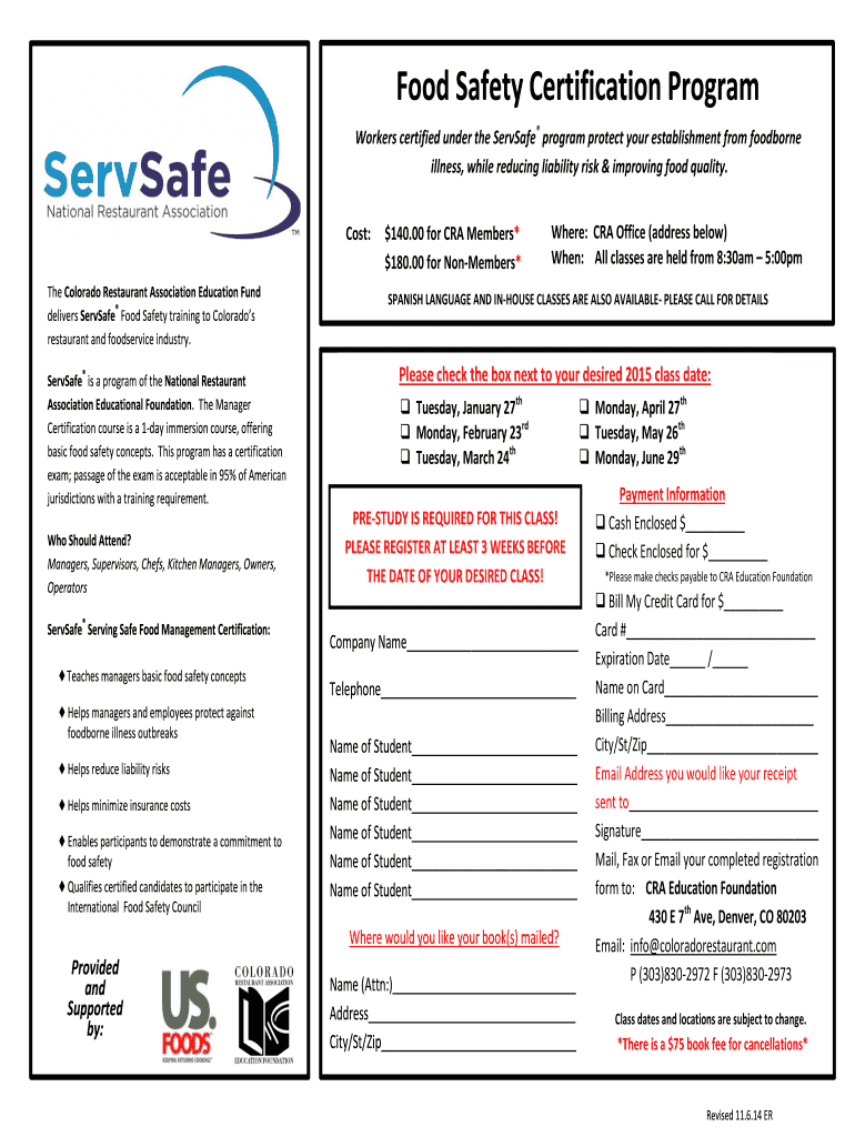 Food Safety Certification Program Workers certified under the Service program protect your establishment from foodborne illness, while reducing liability risk & improving food quality. Cost: The Colorado