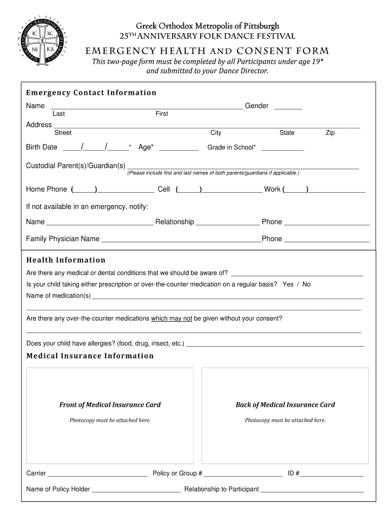 Greek Orthodox Metropolis of Pittsburgh TH 25 ANNIVERSARY Folk Dance Festival Emergency Health and Consent Form This two-page form must be completed by all Participants under age 19* and submitted