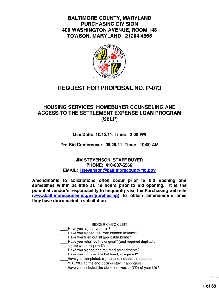 BALTIMORE COUNTY, MARYLAND PURCHASING DIVISION 400 WASHINGTON AVENUE, ROOM 148 TOWSON, MARYLAND 212044665 REQUEST FOR PROPOSAL NO. P073 HOUSING SERVICES, HOMEBUYER COUNSELING AND ACCESS TO THE SETTLEMENT
