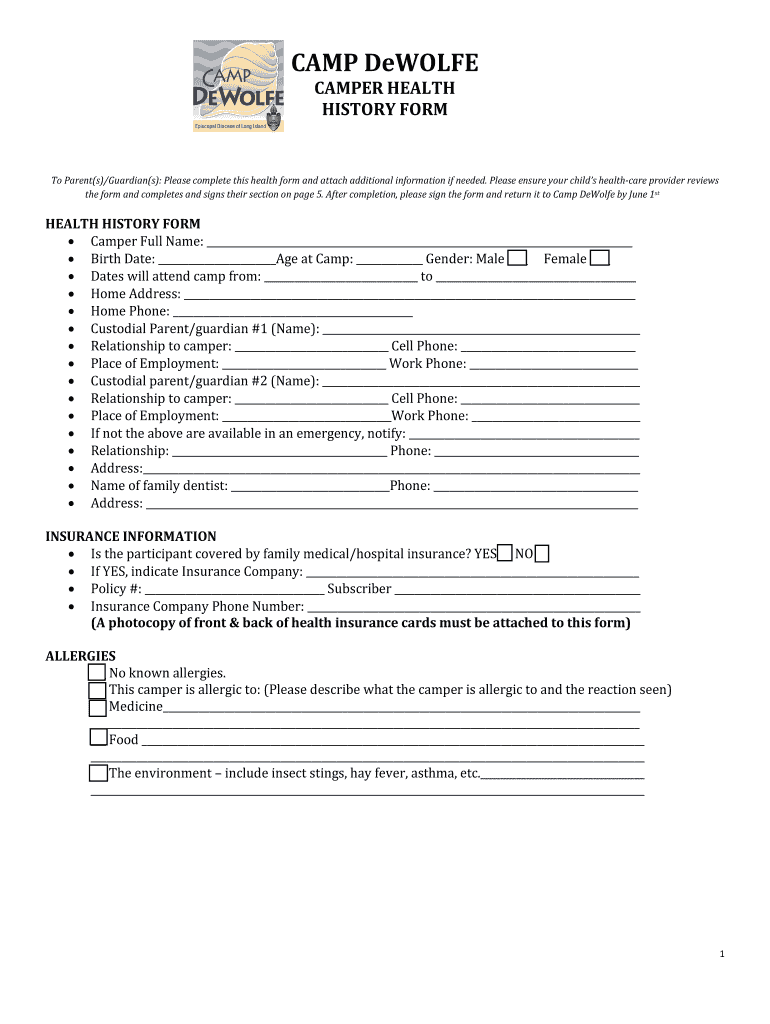 Get the free CAMPER HEALTH HISTORY FORM - Camp DeWolfe - campdewolfe