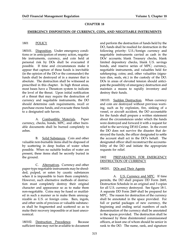 CHAPTER 18EMERGENCY DISPOSITION OF CURRENCY, COIN, AND NEGOTIABLE INSTRUMENTS1801POLICYand perform the destruction of funds held by the