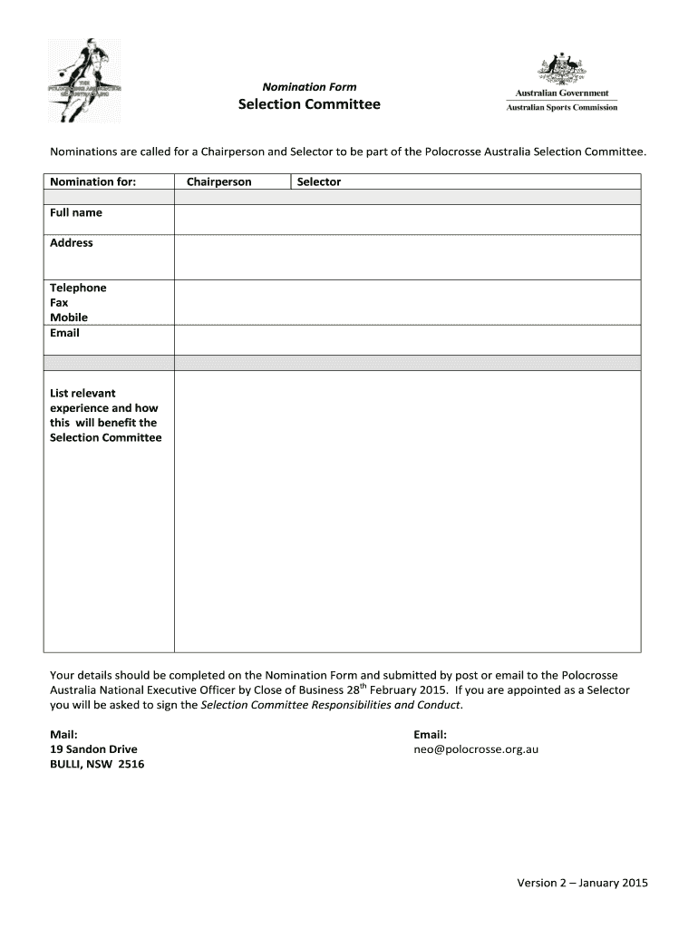 Nomination Form Selection Committee Nominations are called for a Chairperson and Selector to be part of the Lacrosse Australia Selection Committee. Nomination for: Chairperson Selector Full name Address