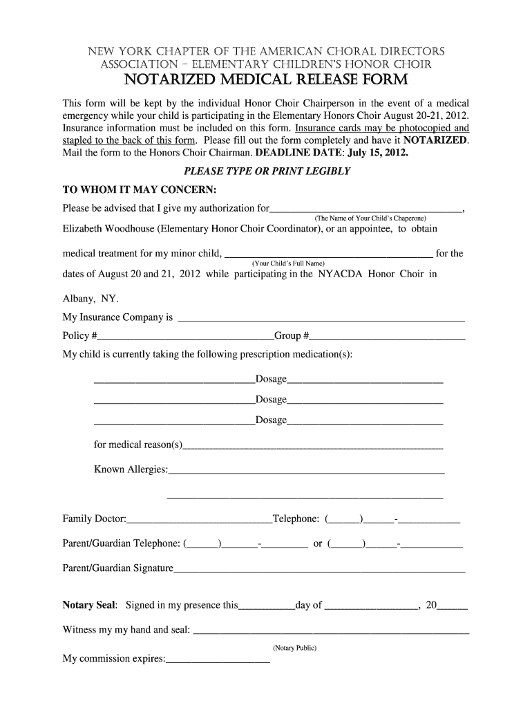 Get the free Notarized medical release form - nyacdaorg