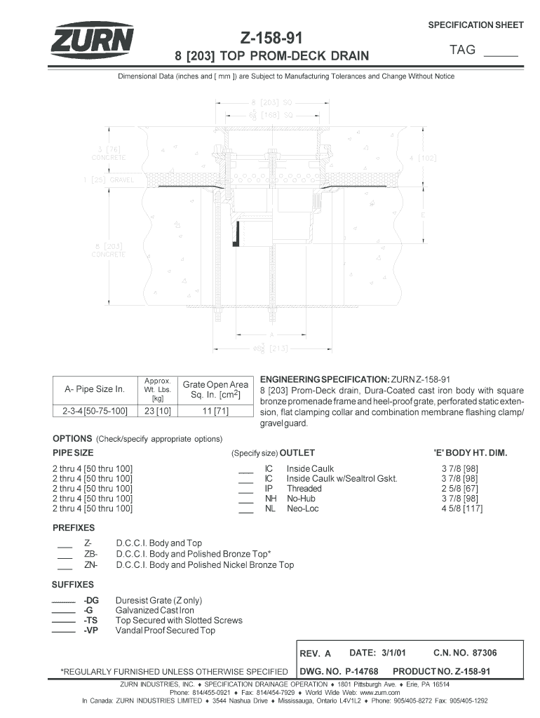 SPECIFICATION SHEET Z15891 TAG 8 203 TOP PROJECT DRAIN Dimensional Data (inches and mm) are Subject to Manufacturing Tolerances and Change Without Notice A Pipe Size In. Approx. Wt. Lbs. Kg Grate