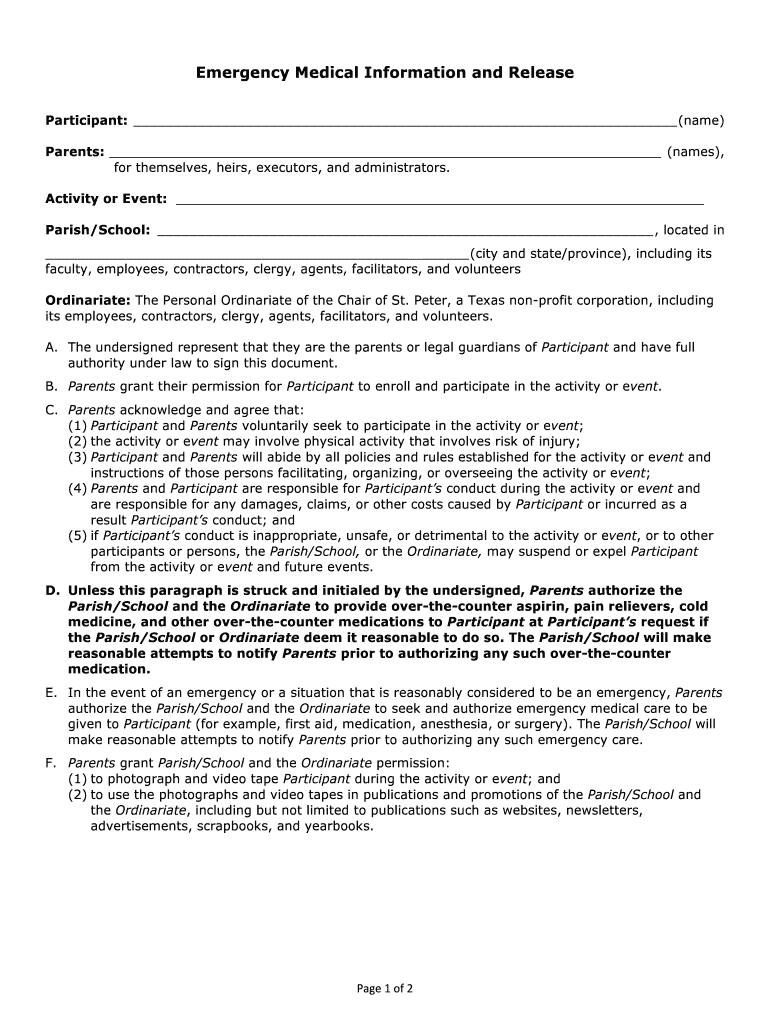 Emergency Medical Information and Release Participant: (name) Parents: (names×, for themselves, heirs, executors, and administrators. Activity or Event: Parish×School:, located in (city and state×province×,