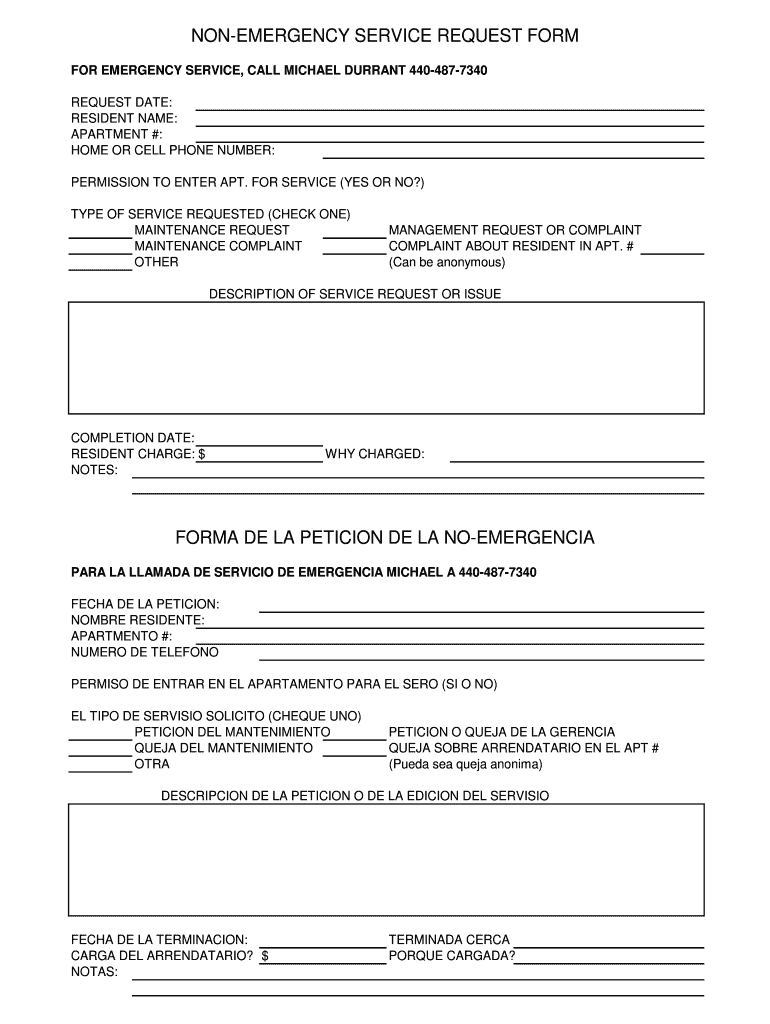 Nonemergency service request form for emergency service, call Michael Durant 4404877340 request date: resident name: apartment #: home or cell phone number: