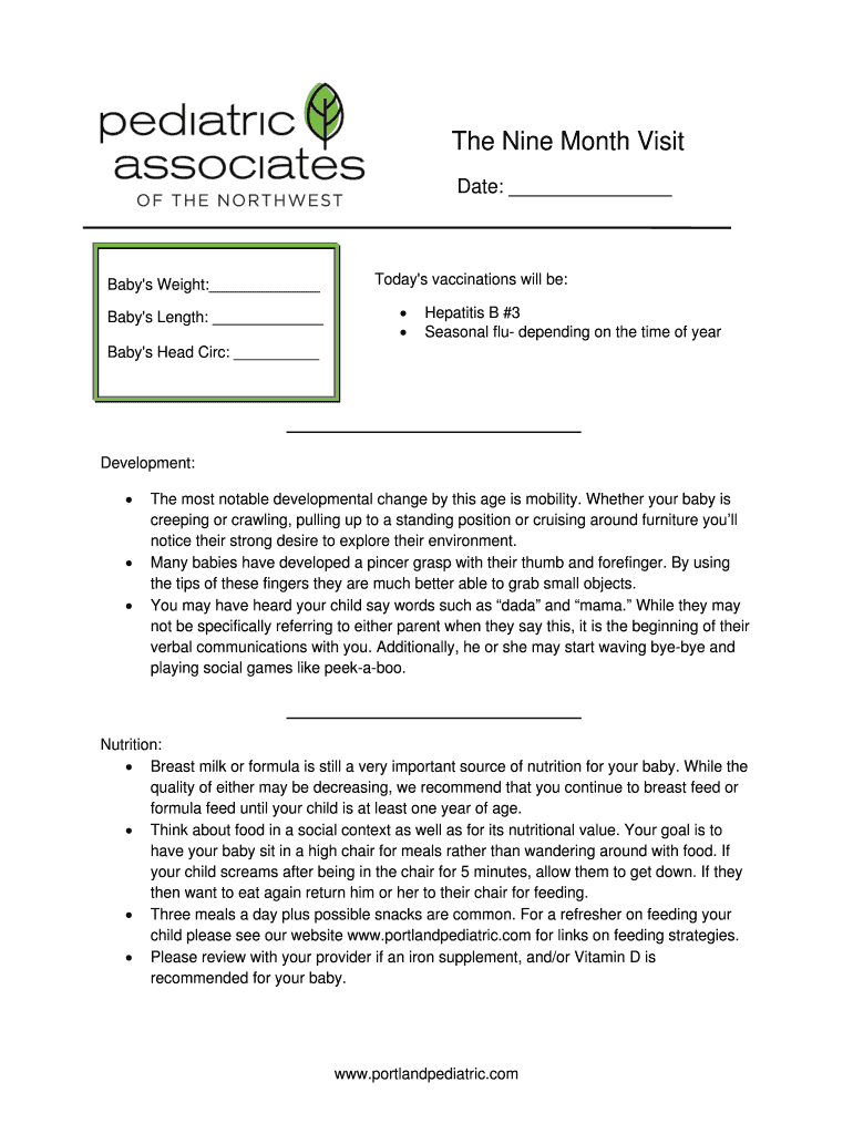 The Nine-Month Visit Date: Baby's Weight: Baby's Length: Today's vaccinations will be: Hepatitis B ×3 Seasonal flu depending on the time of year Baby's Head CIRC: Development: The most notable developmental