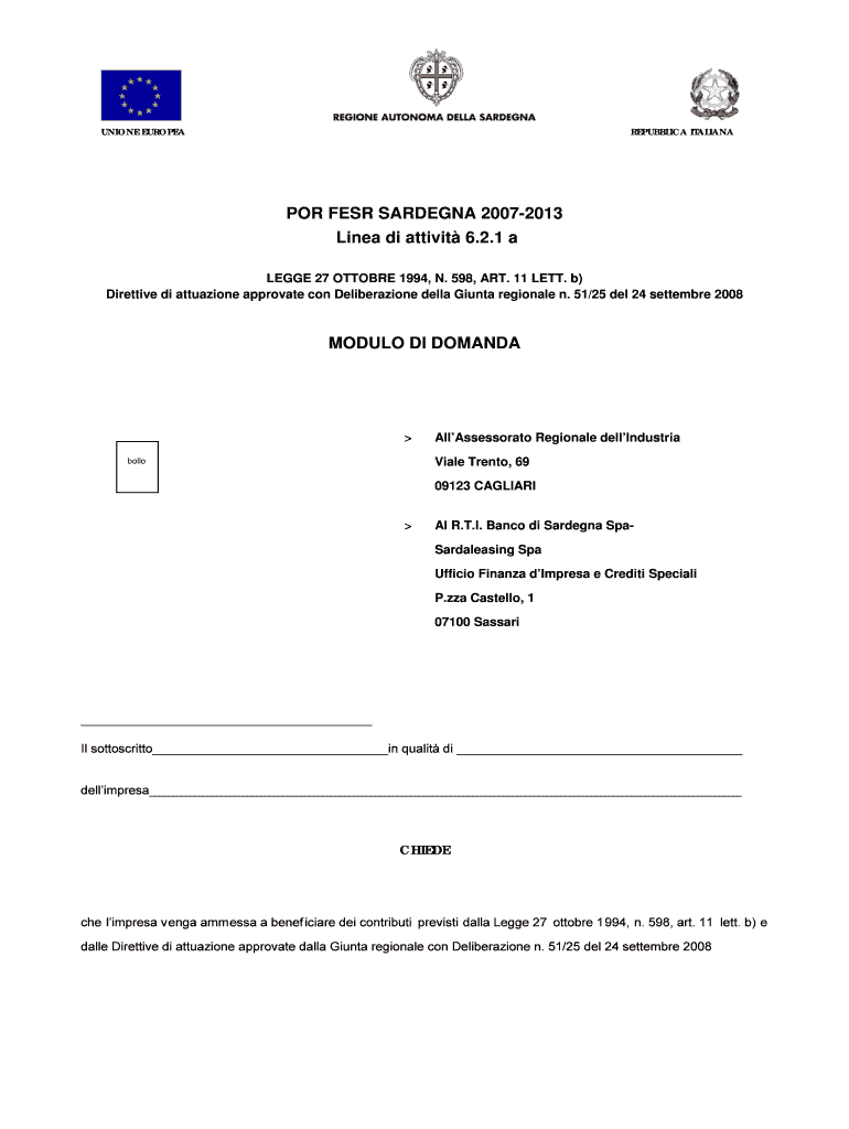 UNION EUROPEAN REPUBLICAN ITALIAN POR FEAR GARDEN 20072013 Line DI activity 6.2.1 a LEGGED 27 OCTOBER 1994, N. 598, ART. 11 LEFT. B) Directive DI actuation approval con Deliberation Della Giant regional
