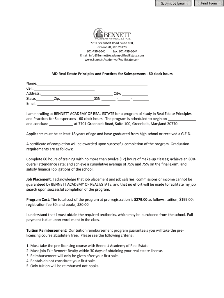This document serves as an enrollment agreement for students wishing to register for the Real Estate Principles and Practices for Salespersons program at Bennett Academy of Real Estate.