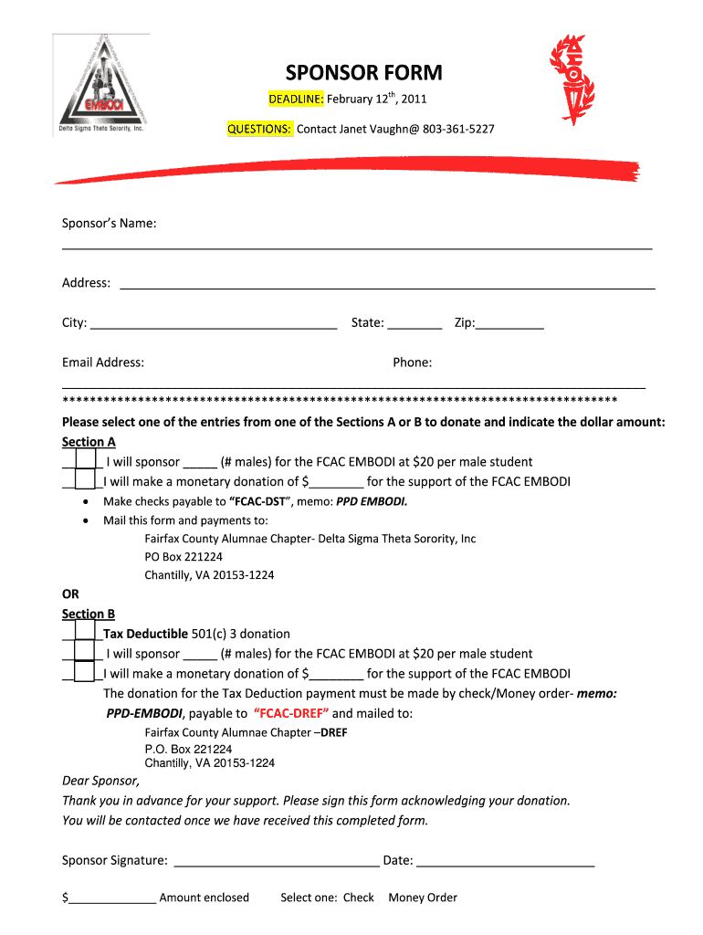 FAIRFAXCOUNTYALUMNAECHAPTER DELTASIGMATHETASORORITY, INC. P.O. Box221224 Chantilly,VA201531224 www.fcacdst.org January 13, 2011, Greetings: The Fairfax County Alumnae Chapter of Delta Sigma Theta