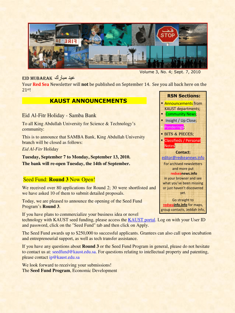 Volume 3, No. 4; Sept. 7, 2010EID MUBARAK Your Red Sea Newsletter will not be published on September 14. See you all back here on the 21st!FAUST ANNOUNCEMENTS EID Alfie Holiday Samba Bank To all King