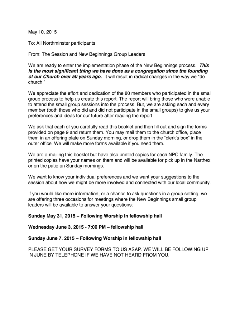 We are ready to enter the implementation phase of the New Beginnings process. This