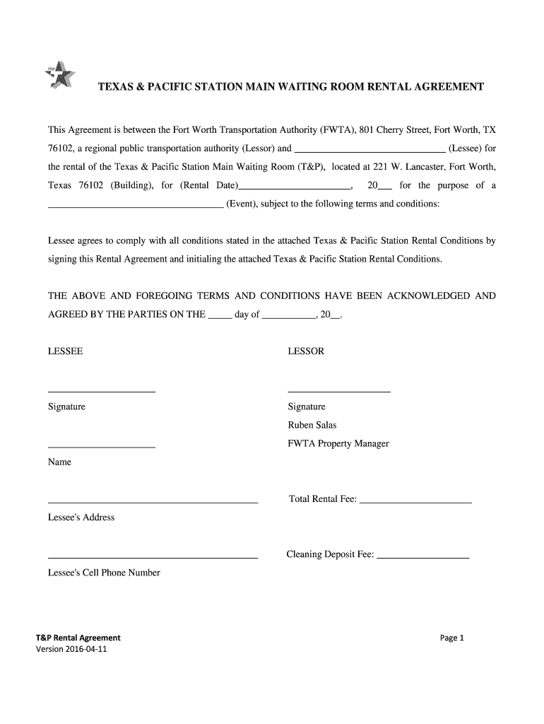 TEXAS & PACIFIC STATION MAIN WAITING ROOM RENTAL AGREEMENT This Agreement is between the Fort Worth Transportation Authority (WTA×, 801 Cherry Street, Fort Worth, TX 76102, a regional public transportation