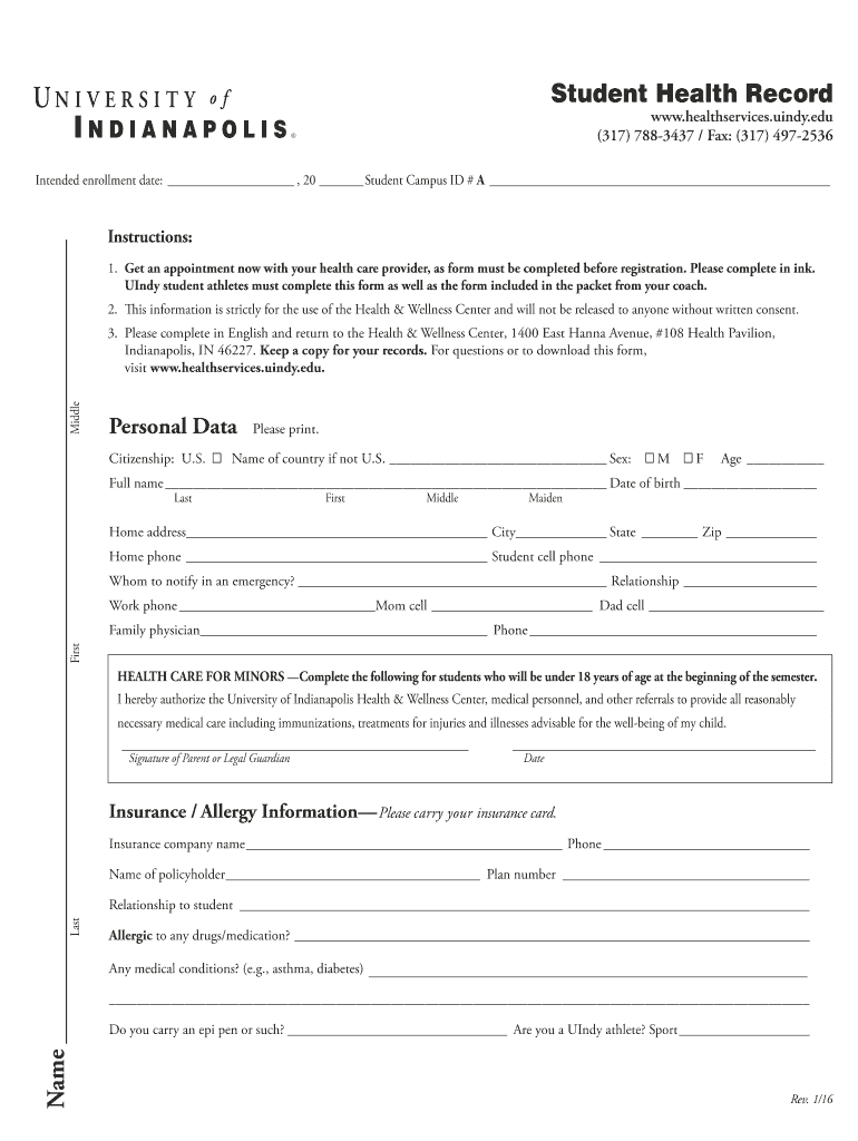 Student Health Record www.healthservices.uindy.edu (317× 7883437 / Fax: (317× 4972536 Last First Middle Name Intended enrollment date:, 20 student Campus IDs # A S Instructions: 1. Get an appointment