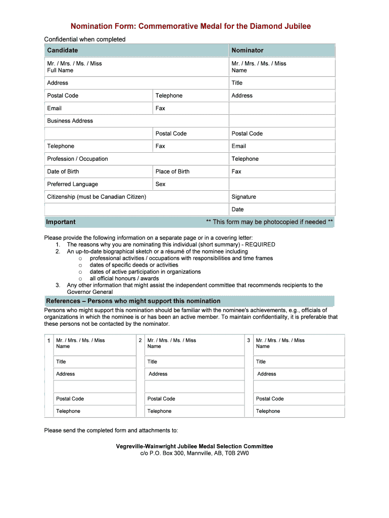 Get the free Nomination Form Commemorative Medal for the Diamond Jubilee