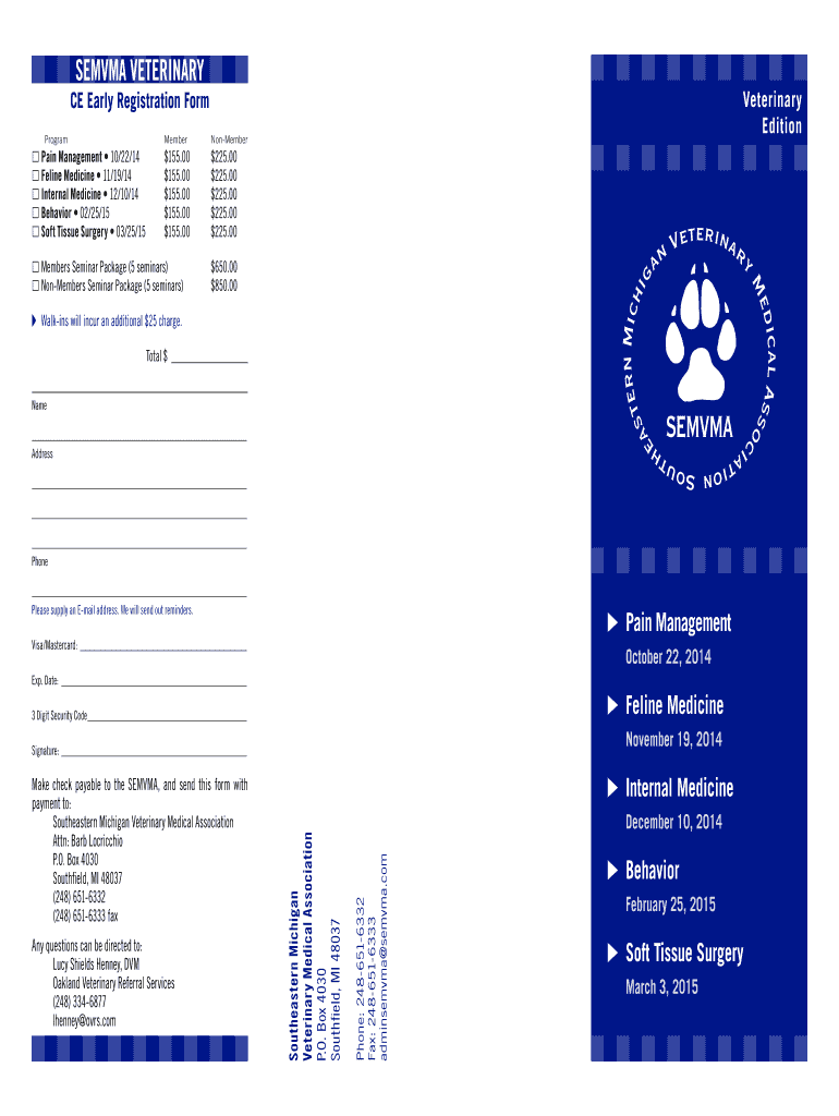 SEM VMA VETERINARY Edition CE Early Registration Form Program Member Nonmember Pain Management 10×22/14 Feline Medicine 11×19/14 Internal Medicine 12×10/14 Behavior 02×25/15 Soft Tissue Surgery