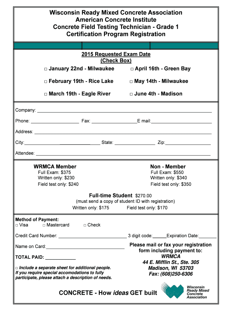 Print Form The Program How To Register This training course offers instruction in the fundamentals of concrete Complete the enclosed registration form. If paying by check, make testing procedures.