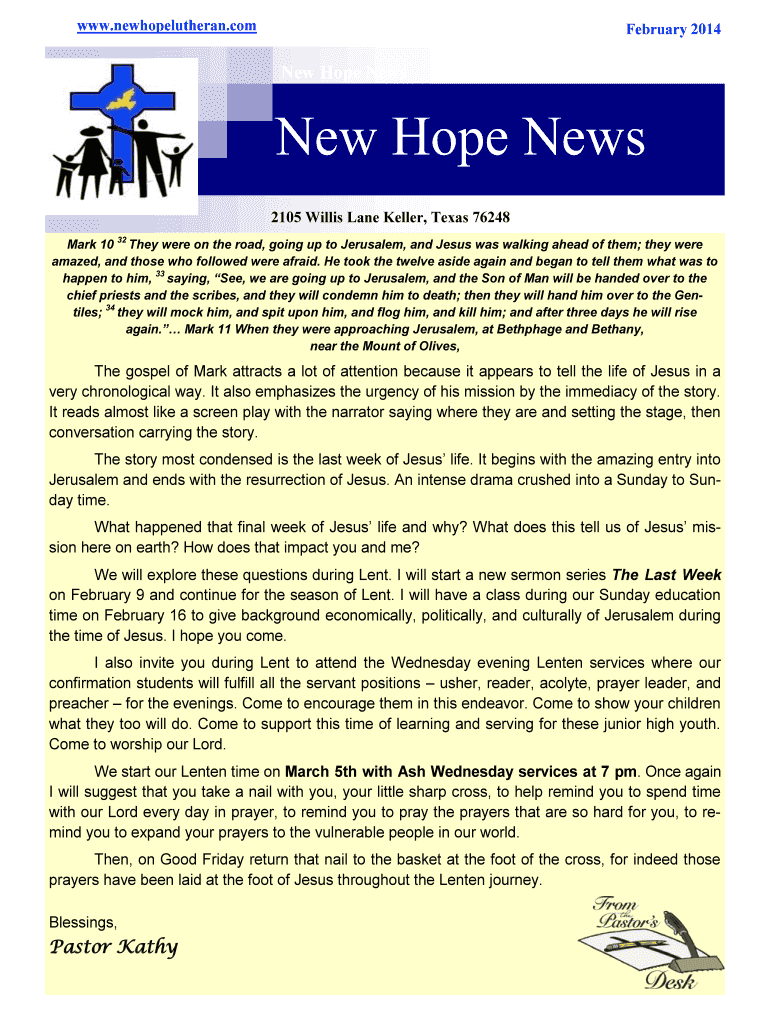 WWW.newhopelutheran.com February 2014 New Hope News New Hope News 2105 Willis Lane Keller, Texas 76248 Mark 10 32 They were on the road, going up to Jerusalem, and Jesus was walking ahead of them;