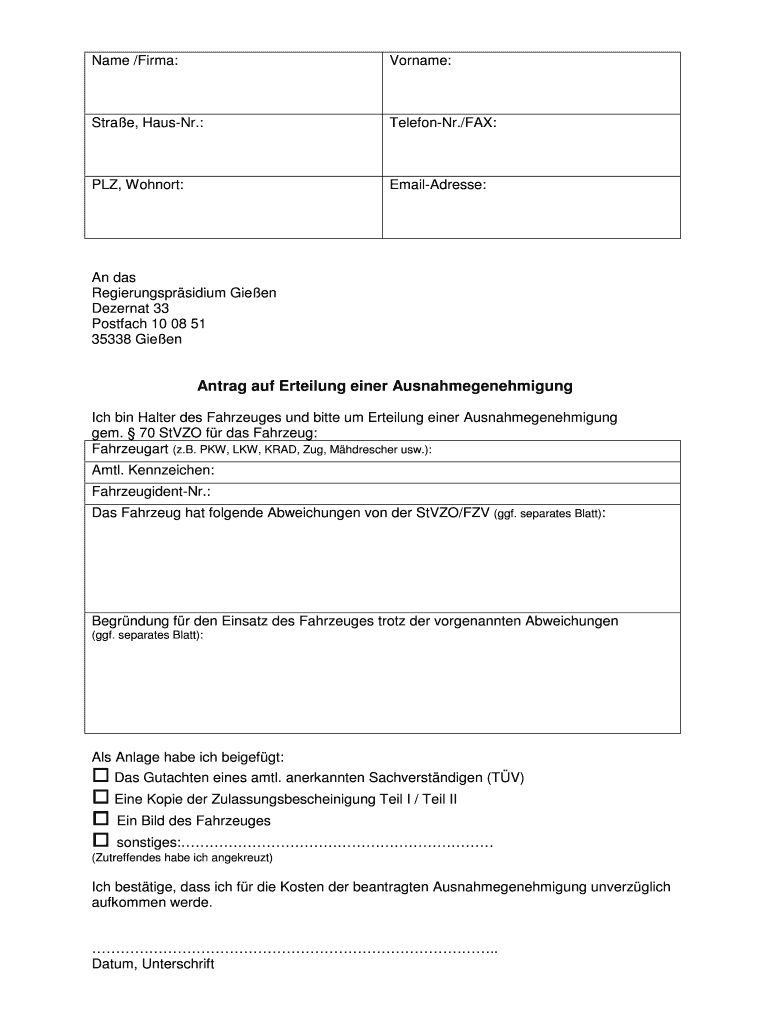 Name /Firm: Surname: Straw, Haunt.: Telephoner.×FAX: PLY, Cohort: EmailAdresse: And was Regierungsprsidium Given Defeat 33 Postal 10 08 51 35338 Given Ant rag AUF Derailing anger Ausnahmegenehmigung