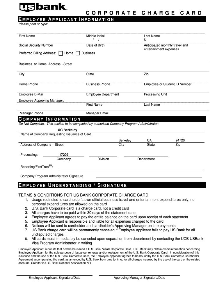 Sample or Example of a Completed Corporate Charge Card Employee Application