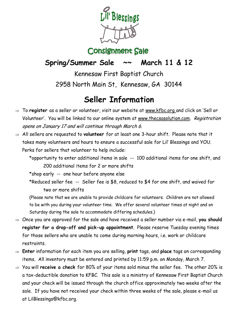 Consignment Sale Spring×Summer Sale March 11 & 12 Kennesaw First Baptist Church 2958 North Main St, Kennesaw, GA 30144 Seller Information To register as a seller or volunteer, visit our website at