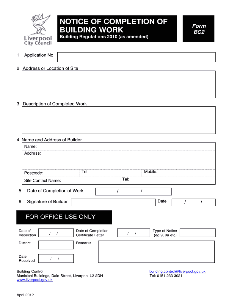 This document serves as a notice for the completion of building work as required by Building Regulations 2010, ensuring that local authorities are informed promptly of such completions.