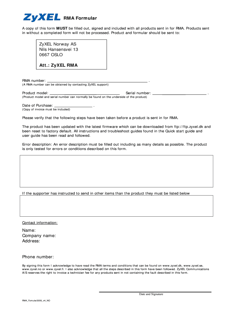 RMA Formula A copy of this form MUST be filled out, signed and included with all products sent in for RMA. Products sent in without a completed form will not be processed. Product and formula should