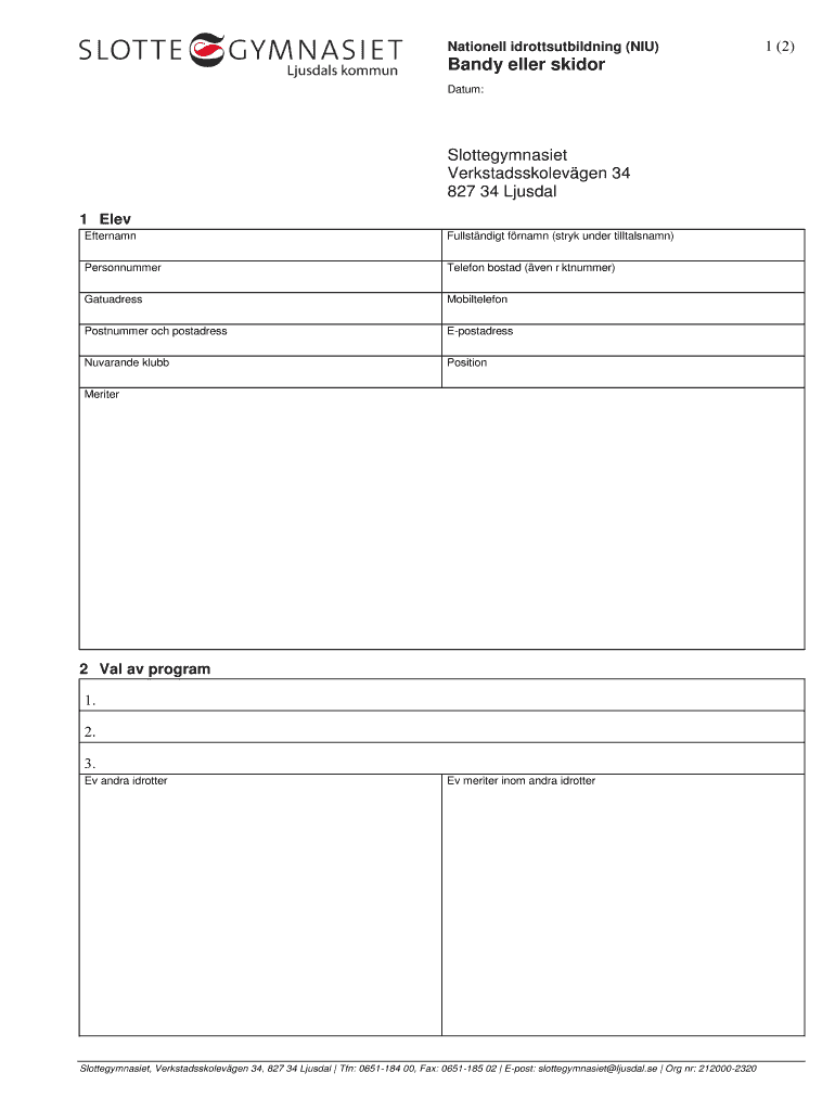 Nation ell idrottsutbildning (NIU) Bandy elder skid or Datum: Slottegymnasiet Verkstadsskolevgen 34 827 34 Unusual 1 Elev External Fullstndigt frame (story under tilltalsnamn) Personnummer Telephone