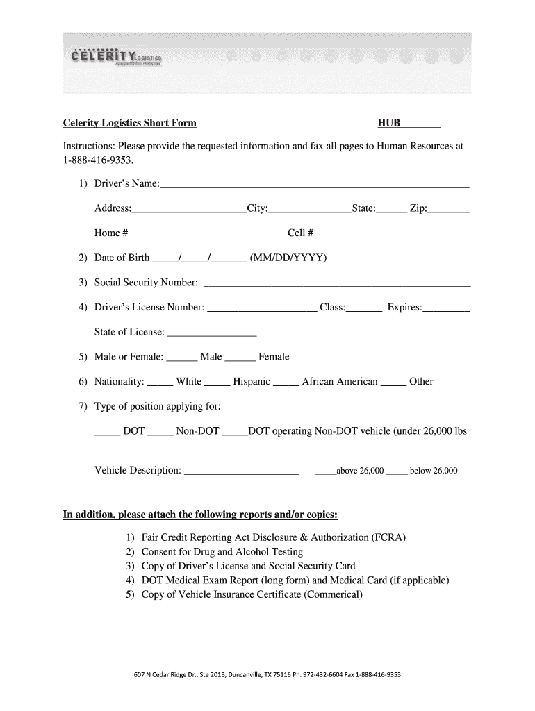 Celerity Logistics Short Form HUB Instructions: Please provide the requested information and fax all pages to Human Resources at 18884169353. 1) Drivers Name: Address: City: State: Zip: Home # Cell