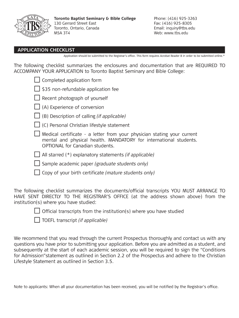 Toronto Baptist Seminary & Bible College 130 Gerrard Street East Toronto, Ontario, Canada M5A 3T4 Phone: (416× 9253263 Fax: (416× 9258305 Email: inquiry tbs.edu Web: www.tbs.edu APPLICATION CHECKLIST