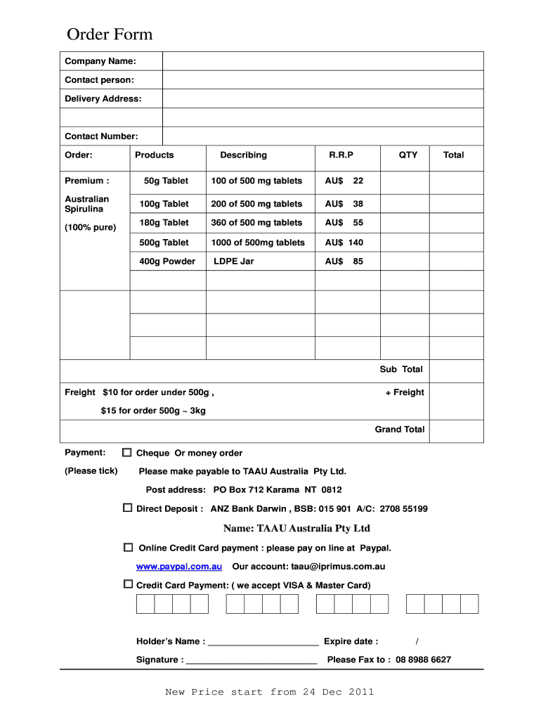 AAU Australia Pty Ltd ACN: 16 073 690 856 Tel 618 8988 6566 Fax 618 89886627 Mail: Po Box 712 Karma NT 0812 Australia Email: AAU iprimus.com.AU Web : www.taau.com.au 1. Premium grade Spirulina : Australian