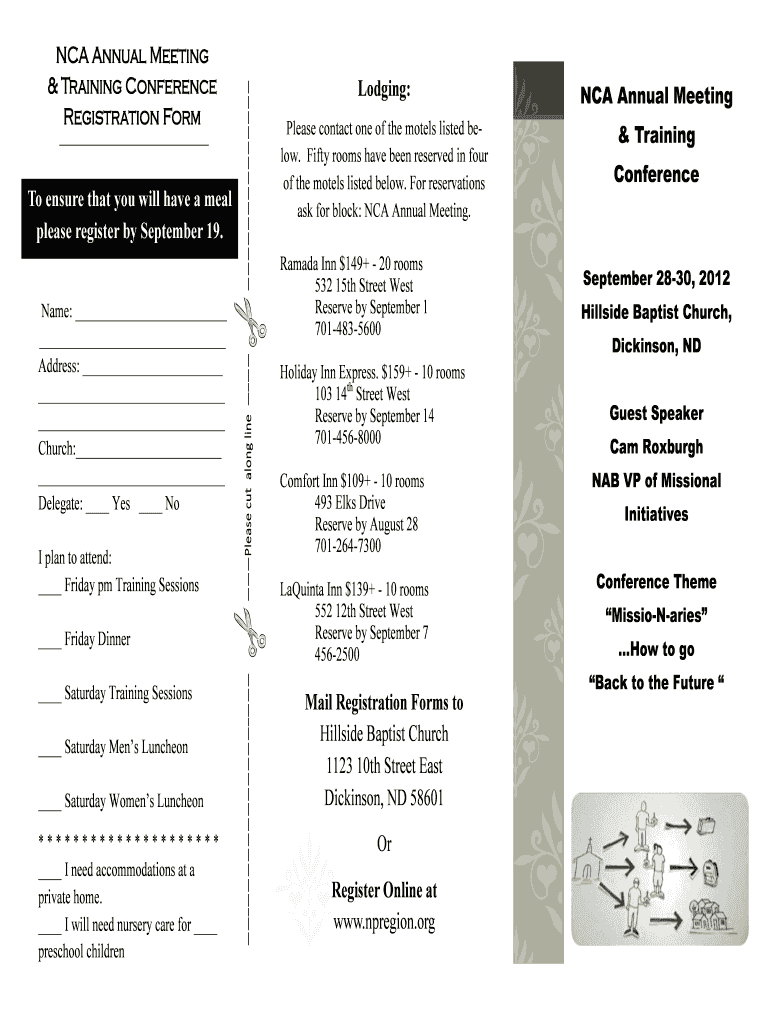 Name: Address: Church: Delegate: Yes No I plan to attend: Friday pm Training Sessions To ensure that you will have a meal please register by September 19. Please cut along line NCA Annual Meeting