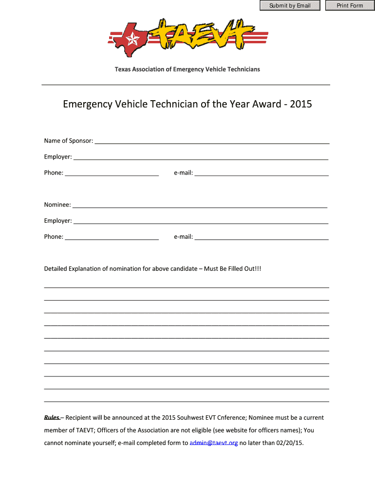 Submit by Email TexasAssociationofEmergencyVehicleTechnicians EmergencyVehicleTechnicianoftheYearAward2015 NameofSponsor: Employer: Phone: email: Nominee: Employer: Phone: email: DetailedExplanationofnominationforabovecandidateMustBeFilledOut!!!