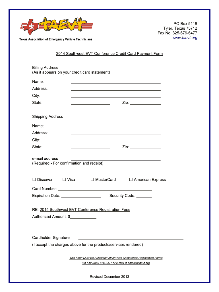 PO Box 5116 Tyler, Texas 75712 Fax No. 3256766477 www.taevt.org Texas Association of Emergency Vehicle Technicians 2014 Southwest EAT Conference Credit Card Payment Form Billing Address (As it appears