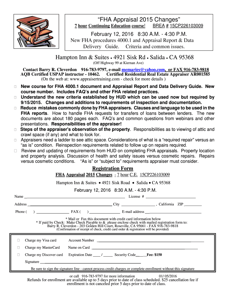 FHA Appraisal 2015 Changes 7 hour Continuing Education course! AREA # 15CP226103009 February 12, 2016 8:30 A.M. 4:30 P.M. New FHA procedures 4000.1 and Appraisal Report & Data Delivery Guide. Criteria