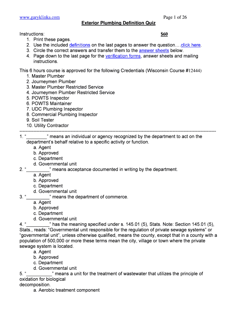 To fill out the Exterior Plumbing Definition Quiz, participants must read each question carefully, select the appropriate answers based on their knowledge of exterior plumbing, and submit the quiz as instructed.