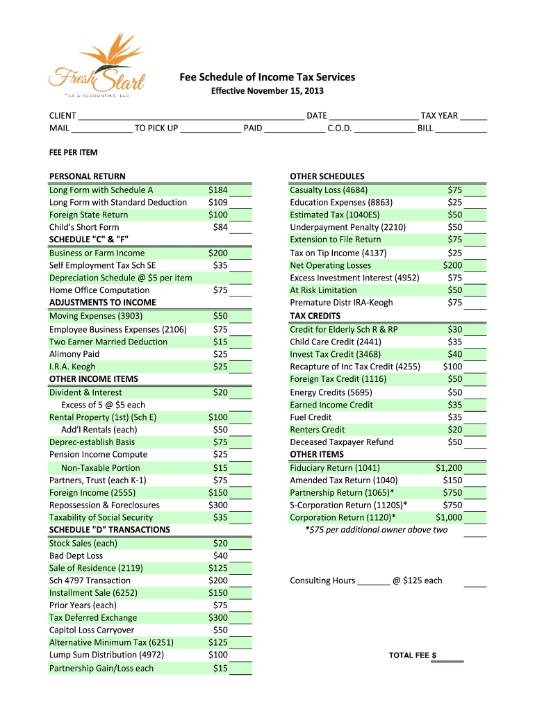 Get the free Tax Prep Fee Schedule Here - Fresh Start Tax & Accounting, LLC