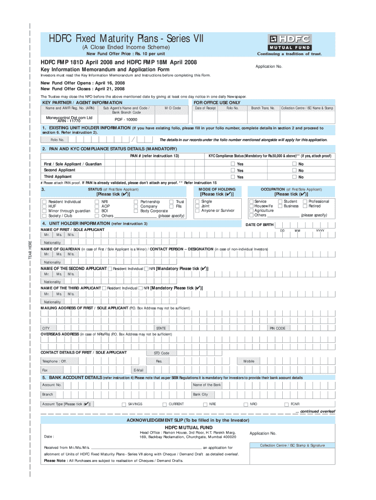 The HDFC Fixed Maturity Plans Application Form is a financial document used by investors to apply for units in the HDFC Fixed Maturity Plans - Series VII.