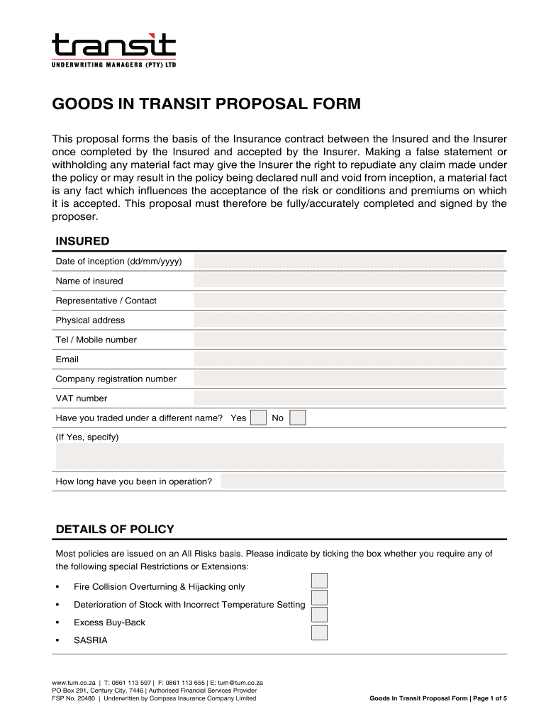 Get the free GOODS IN TRANSIT PROPOSAL FORM - Transit Underwriting Managers - tum co
