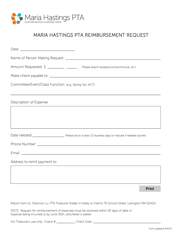 PTA members: Any member of the PTA who has incurred approved expenses for the benefit of the association or its activities, such as organizing fundraisers or purchasing supplies, may need to fill out a reimbursement form to be reimbursed for those expenses.
